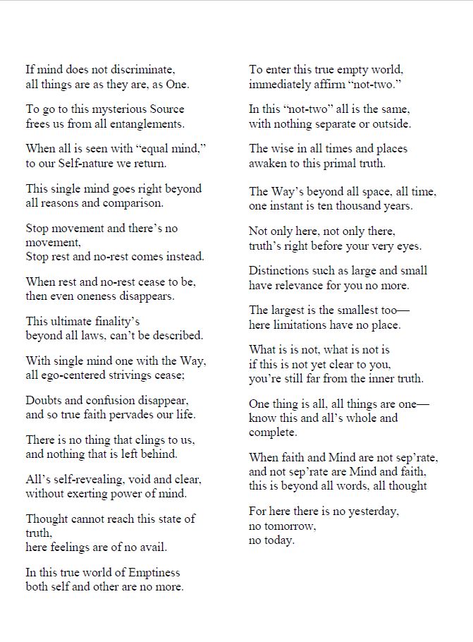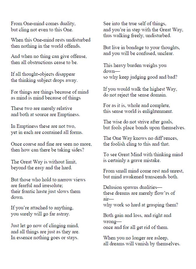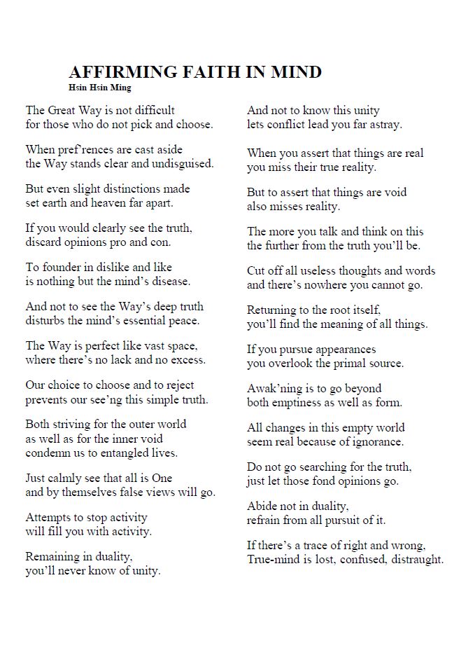 The Xin Xin Ming, or “affirming faith in mind” is the best guideline to practice that i have ever found in my life…… it was as much daoist as zen. I am including a copy here with a humble interpretation of what i have come to understand from this text.