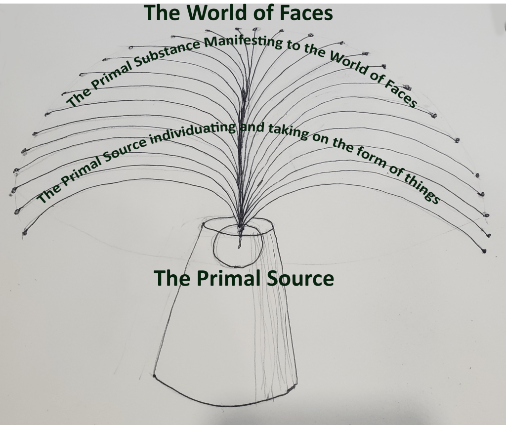 This diagram is a different view of the relationship between the Creator: the Primal Source of Everything, and the Creators relationship to all things in the “World of Faces”. It represents the temporal physical world, how it rises from the Primal Source, and the interconnectedness of the World of Faces to the Primal Source.
